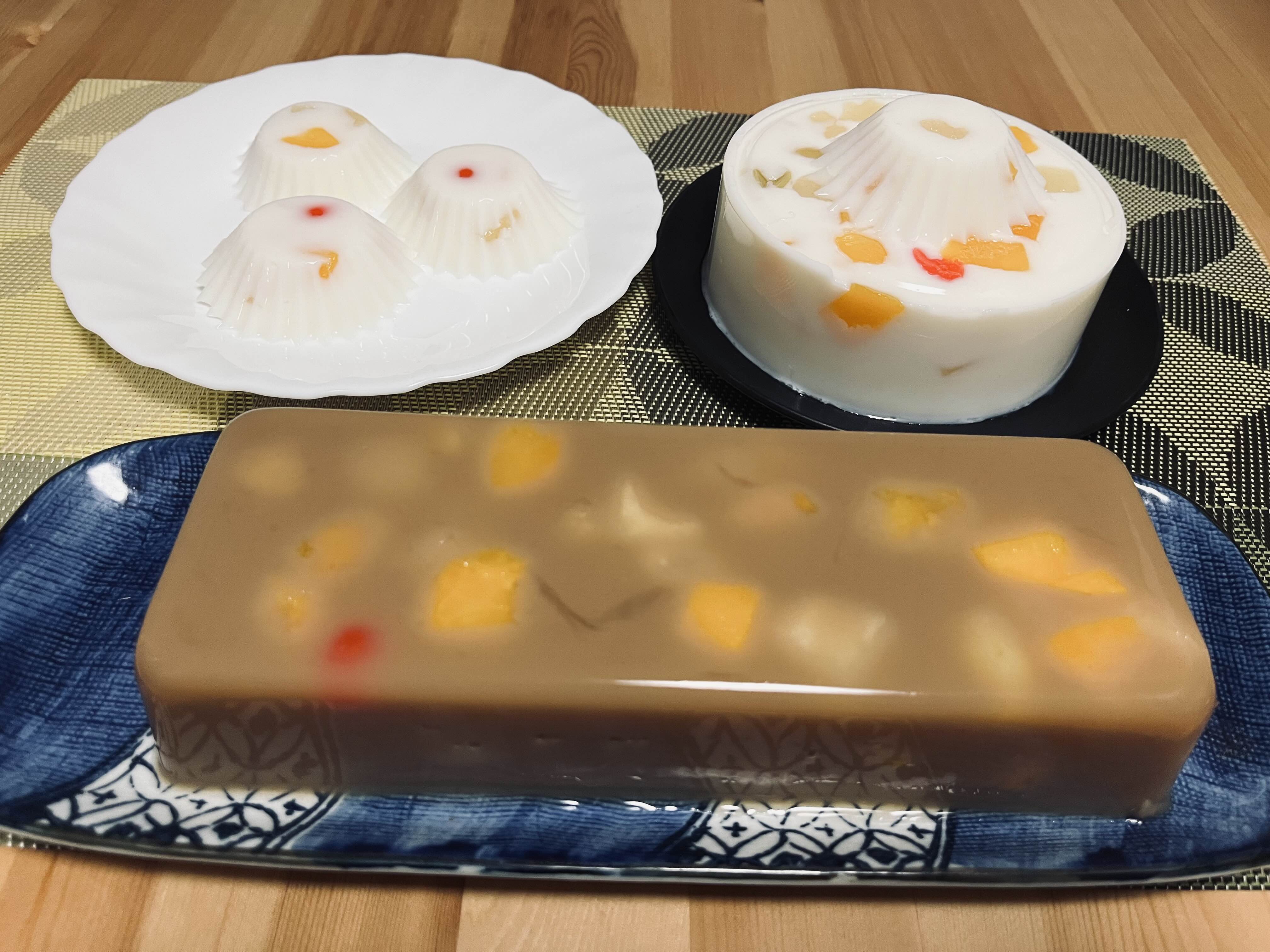 基本のホール型・おかずカップ型フルーツ牛乳寒天とパウンド型ミルクティー寒天のセットになります
